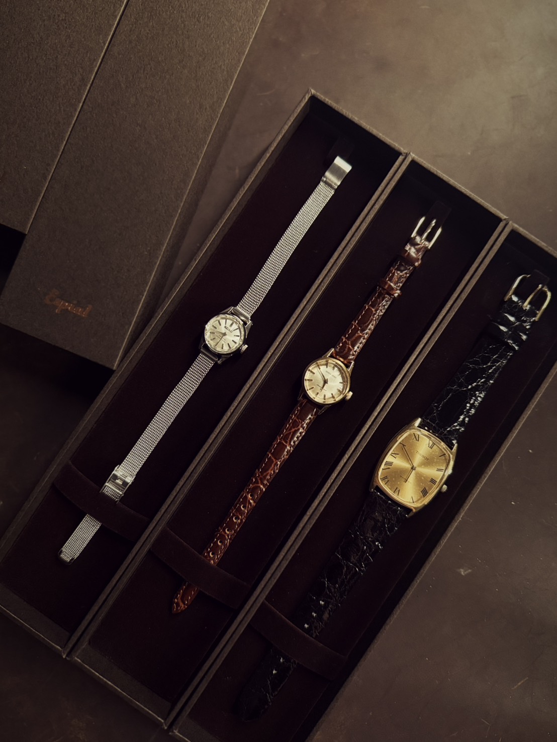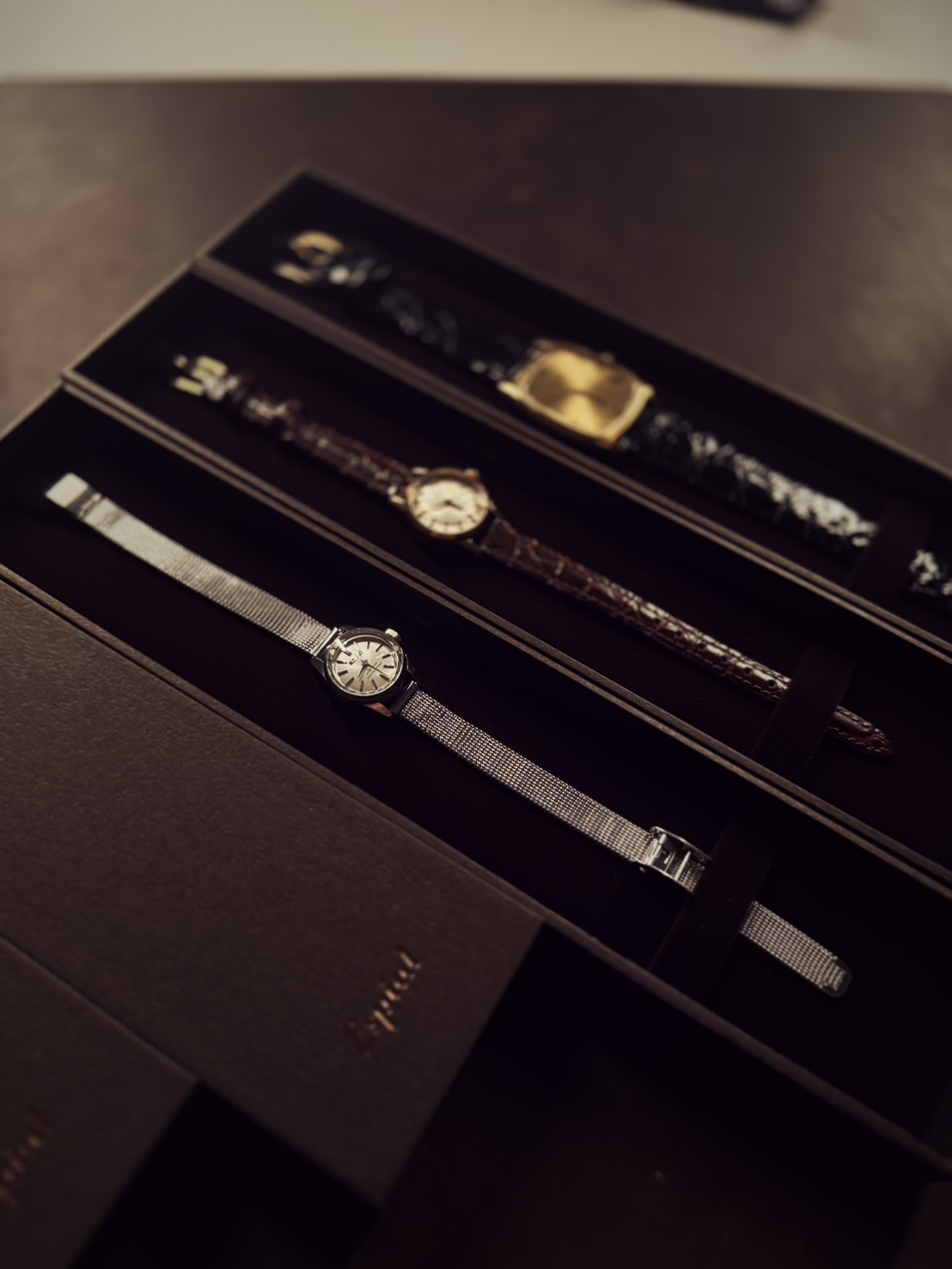 撮影スタジオ Discovery(https://discovery.main.jp/)が日々生み出す静かな光の世界とは別に、前田さんにはもう一つの情熱があります。ヴィンテージウォッチの持つ歴史と物語に魅せられていくなかで、やがてその美しさとストーリーを自ら丁寧に語り伝えながら販売する活動を、3年前から始められました。はじめて弊社にご来社いただいた際、前田さんは愛着のあるヴィンテージの数々を、大事そうに取り出しながら見せてくださいました。その背景に宿るストーリーへの思い入れは深く、語り出すと止まらなくなる姿からは、過剰なまでの商品への愛着と情熱を感じます。